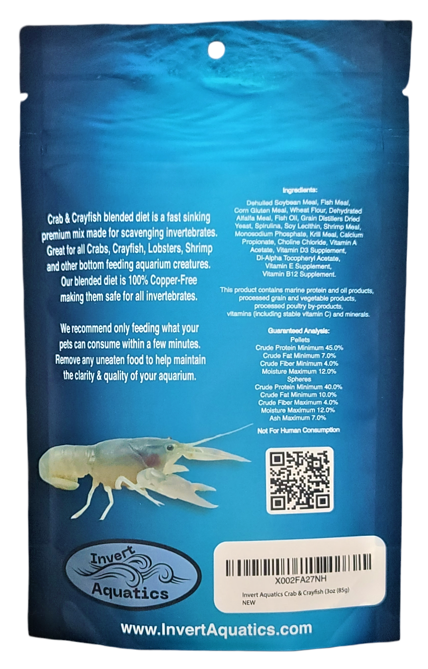 Crab & Crayfish Sinking Blended Diet is a Specially Formulated Diet made from Protein Packed Pellets and Growth Enhancing Sticks. Made with Spirulina and Added Vitamin E, D3 & B12! Great for Red Claw Crabs, Fiddler Crabs, Crayfish and Miniature Lobsters! Shrimp, Snails and other bottom feeders also love this Food!