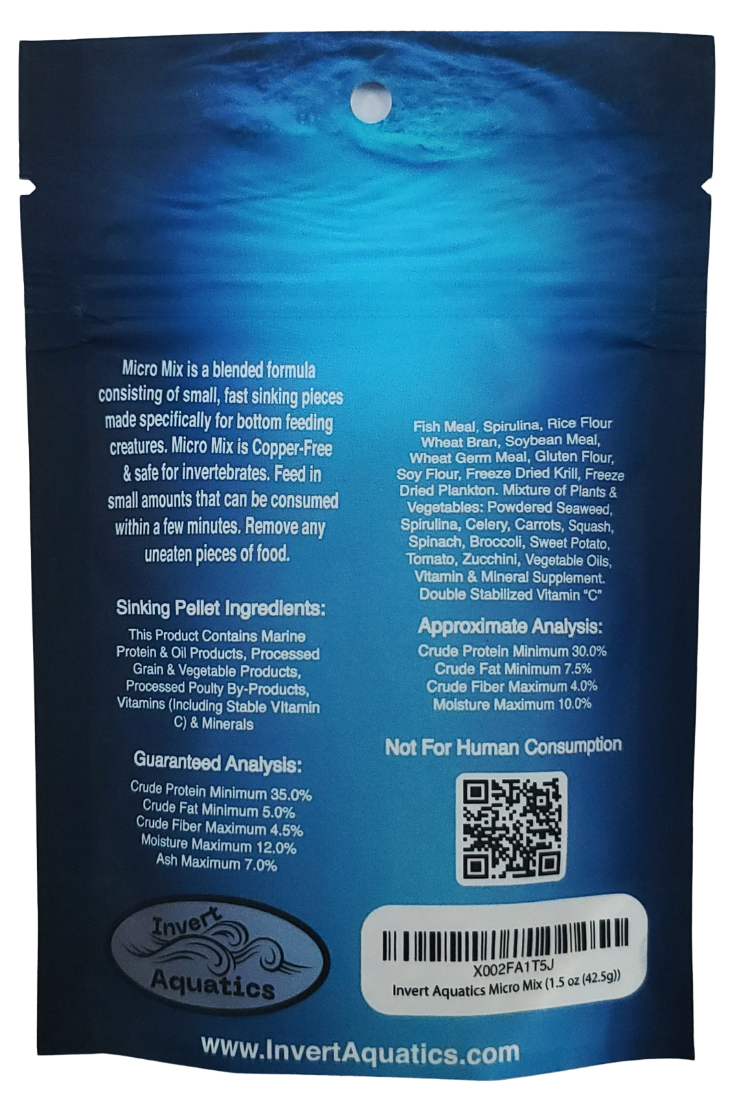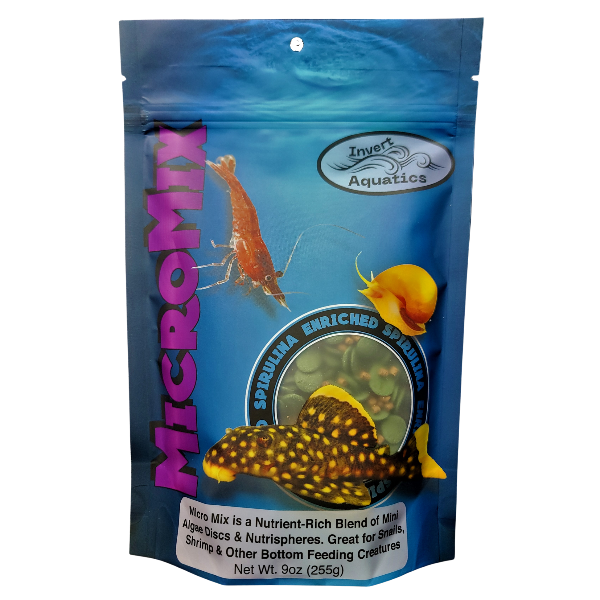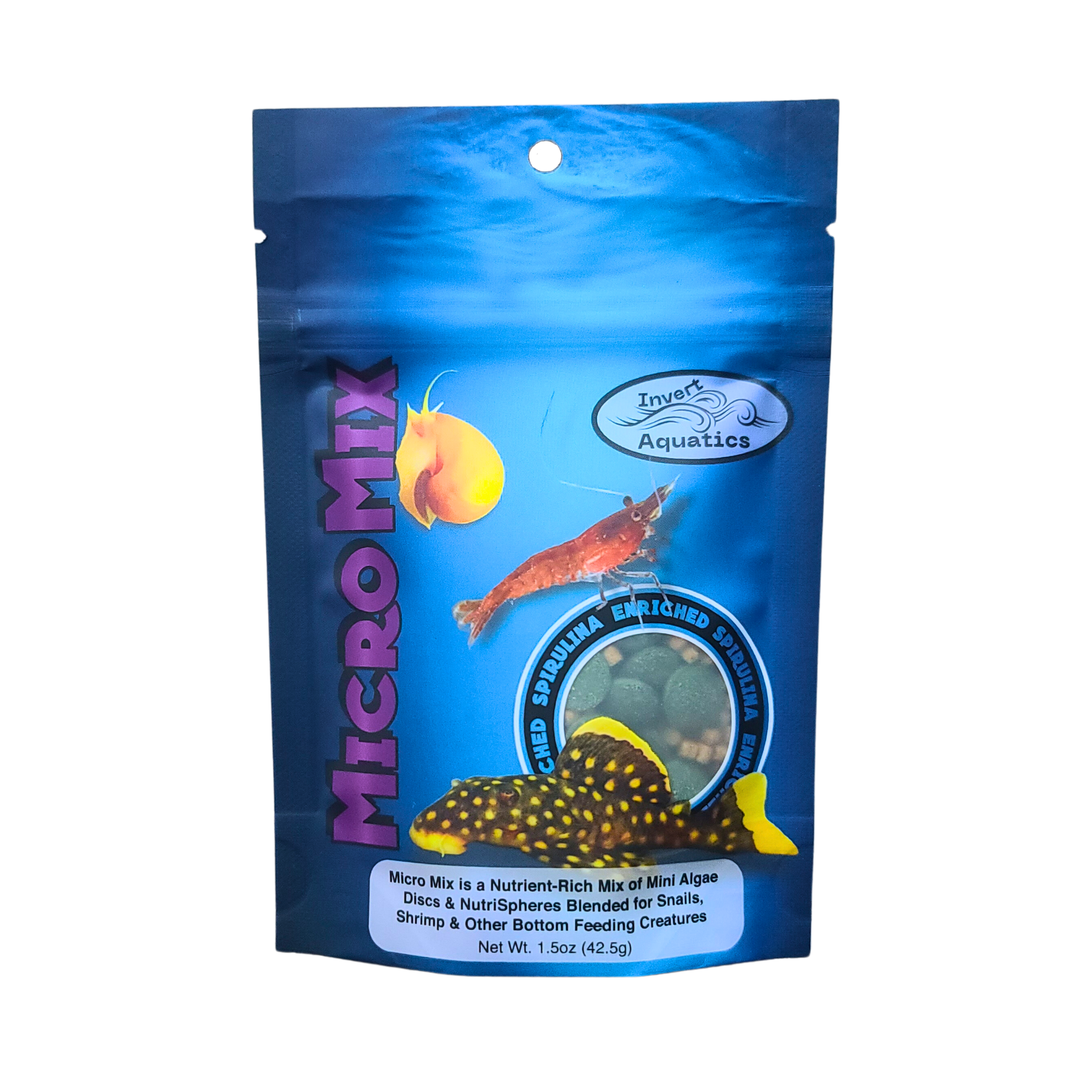 Micro-Mix is a Nutrient-Rich Mix of Mini Algae Discs and NutriSpheres for Snails, Shrimp & Other Bottom Feeding Creatures. This fast sinking, blended formula is rich in vitamins and minerals for total daily nutrition. Plecos, Corys, Mystery Snails, Cherry Shrimp, All Love Micro Mix! This is the primary food we feed all of our snails and shrimps! This is a great blended diet that they have been thriving on! We highly recommend feeding any of our Snails and Shrimps this Micro-Mix!