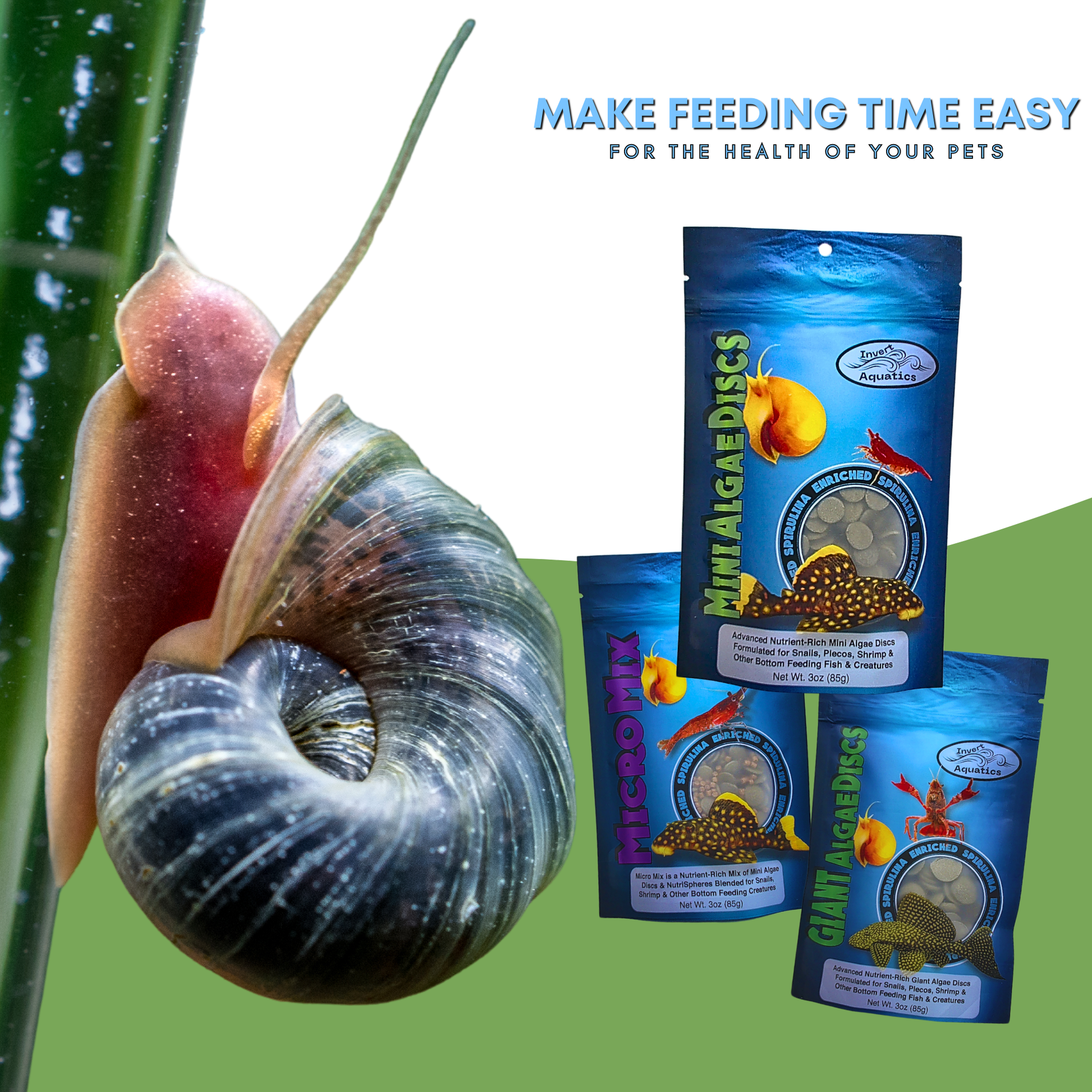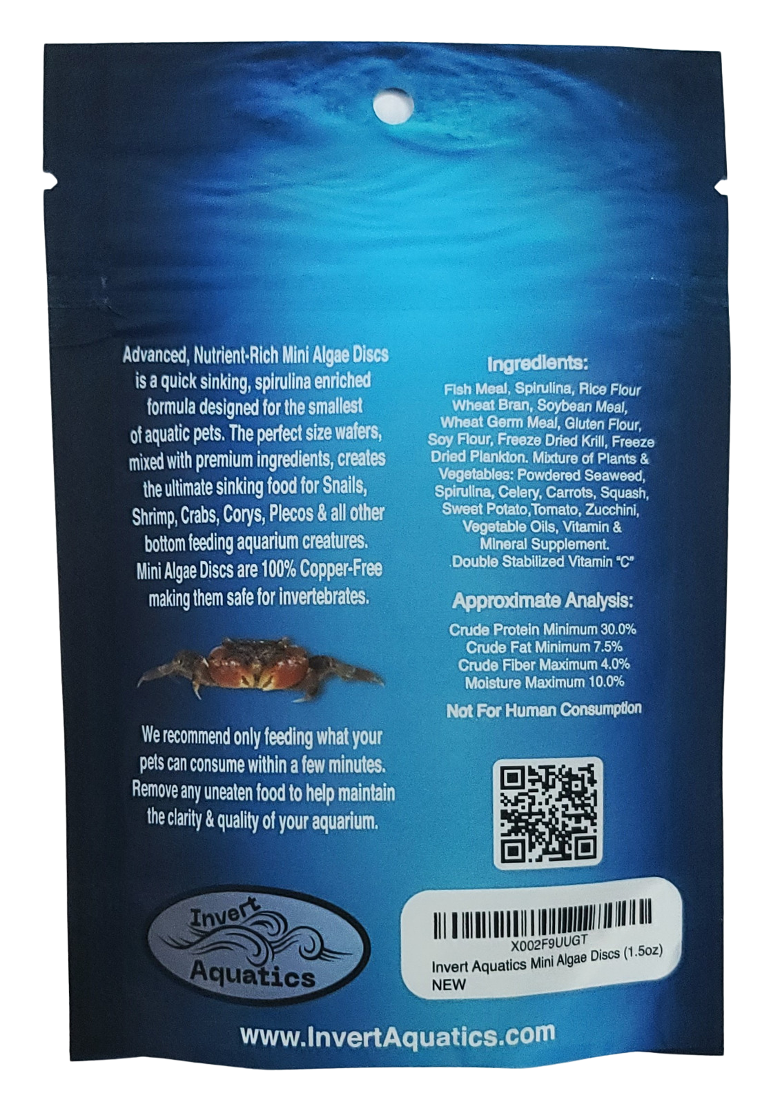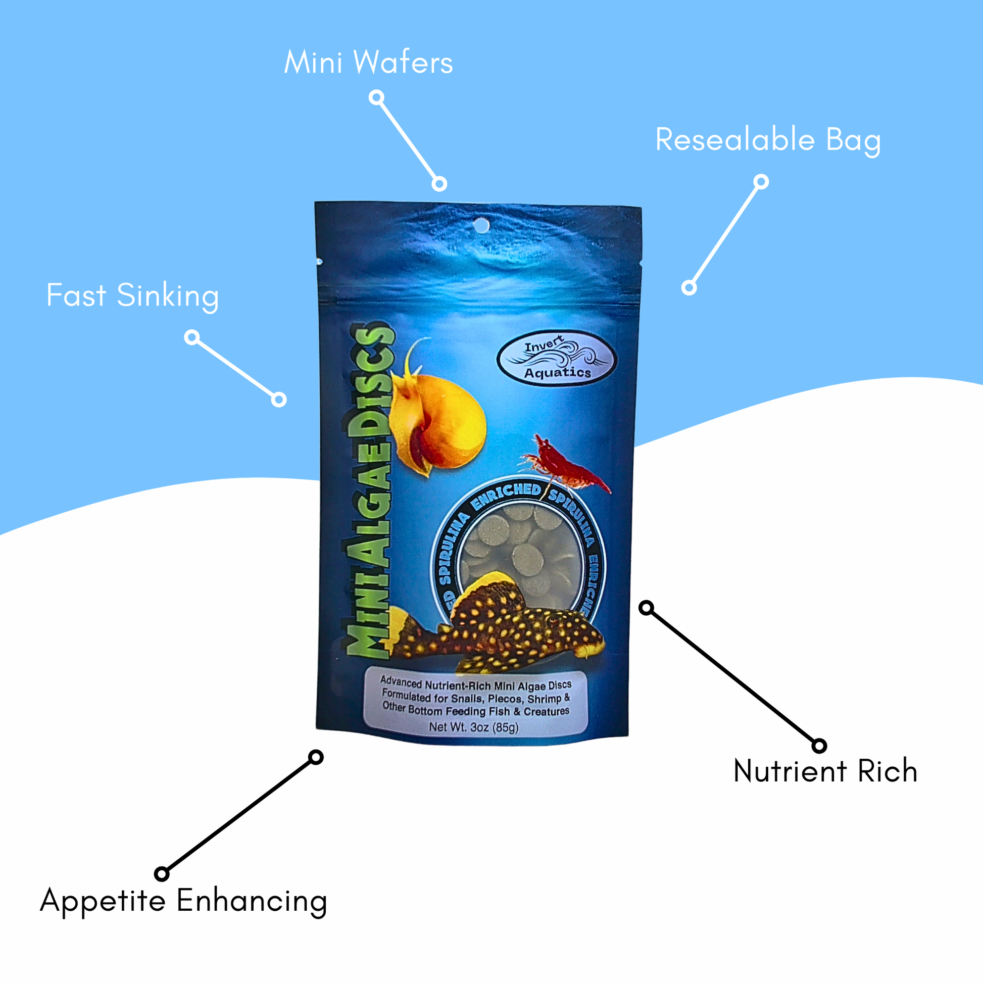 Advanced Nutrient-Rich Mini Algae Discs for Snails, Shrimp & Other Bottom Feeding Creatures. Quick sinking, spirulina enriched diet designed for our smallest of aquatic pets. The perfect size wafers, mixed with premium ingredients, creates the ultimate sinking food for Snails, Shrimp, Crabs, Corys, Plecos and all other bottom feeders!
